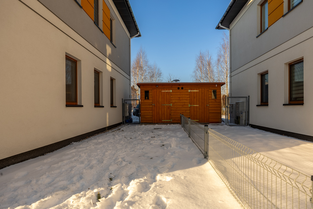 Dodatkowym atutem jest ogród wokół mieszkania o powierzchni 140m2 z domkiem ogrodowym na osprzęt, narzędzia, rowery.