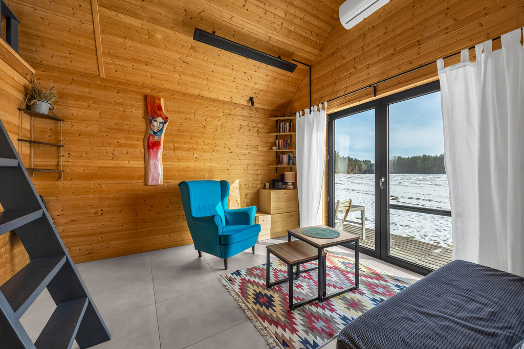 Salon z wyjściem na taras z widokiem na las, aneks kuchenny z oknem, łazienka z oknem (prysznic, toaleta, umywalka), sypialnia na antresoli, taras.