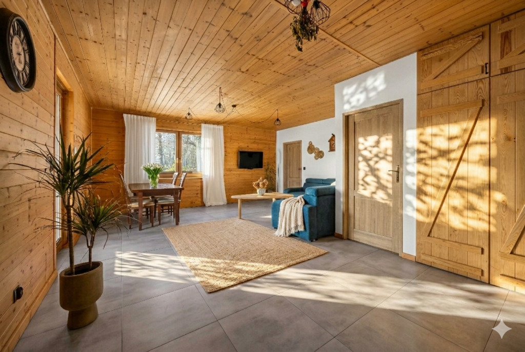 Dom wykończony w dobrym standardzie. Do sprzedania z całym wyposażeniem, ze wszystkimi meblami i sprzętami. Funkcjonalna, w pełni wyposażona kuchnia w kolorze ecru, duży salon z wyjściem na taras. Wnętrze całego domu urządzono w stylu wiejskim z dbałością o wygodę - każda z sypialni jest bardzo duża. Łazienka z oknem, nowoczesna, z prysznicem, toaletą, pralko-suszarką i sporą umywalką. Podłoga w domu została pokryta gresem a sypialnie wysokiej jakości panelami. W domu znajduje się również kotłownia z wejściem z kuchni i podwórka. Przy domu jest zadaszona drewutnia przeznaczona do składowania drewna. W całym domu jest założone ogrzewanie podłogowe za wyjątkiem obu sypialni gdzie są kaloryfery.