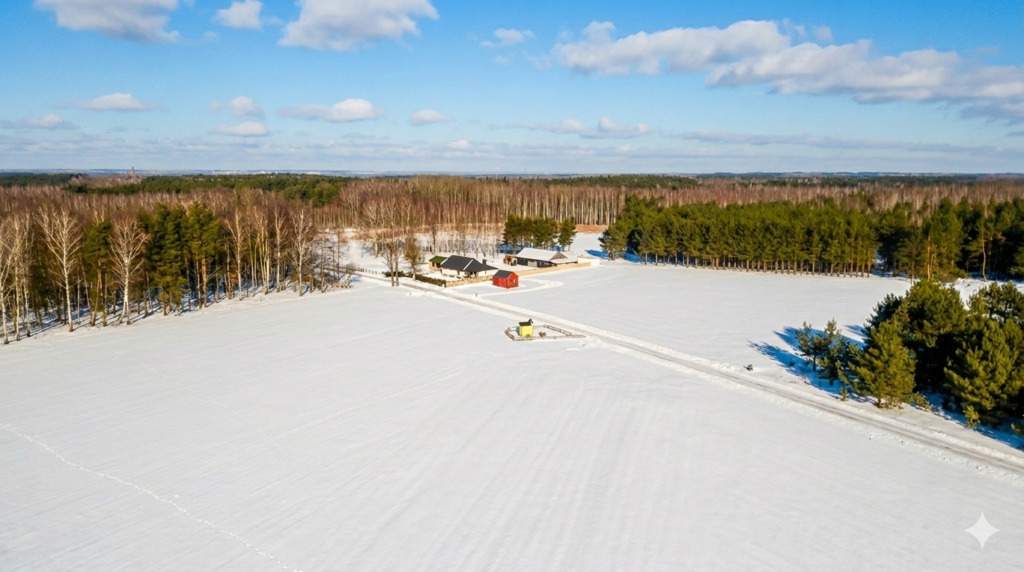 Całość siedliska to zagospodarowana i ogrodzona działka o powierzchni 5.548 m2 oraz sąsiadujące działki graniczące z lasem o powierzchni 50.502 m2. Spokojna, sielska okolica ze świetnym połączeniem komunikacyjnym z dużymi i mniejszymi miastami.