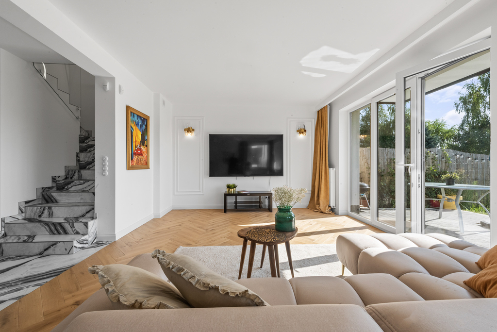 Standard wykończenia: Dom wykończony w wysokim standardzie. Na podłodze w salonie piękna deska dębowa natomiast w kuchni i korytarzu gres hiszpański. Funkcjonalna kuchnia, w pełni wyposażona, w łazienkach ceramika znanych marek, baterie podtynkowe. Wnętrze domu urządzono w nowoczesnym stylu z dbałością o detale i wygodę. Ciepłe kolory, naturalne materiały tworzą przytulną atmosferę.